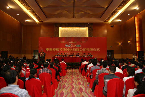 9月28日上午8時(shí)58分,安徽安糧控股股份有限公司(以下簡(jiǎn)稱安糧控股)揭牌儀式在合肥元一希爾頓酒店隆重舉行。安徽國(guó)貿(mào)集團(tuán)董事長(zhǎng)、黨委書記范陽(yáng)以及副董事長(zhǎng)李明菊、總經(jīng)理包祥華應(yīng)邀到會(huì)。香港遠(yuǎn)航集團(tuán)董事長(zhǎng)桂四海先生作為特別嘉賓出席儀式。安糧省糧油食品進(jìn)出口(集團(tuán))公司(以下簡(jiǎn)稱安糧集團(tuán))、安糧控股董事長(zhǎng)及公司其他領(lǐng)導(dǎo)金東、楊世芳、葛志毅、陶余清和國(guó)貿(mào)集團(tuán)核心企業(yè)來(lái)賓——技術(shù)公司總經(jīng)理程峰、輕工公司總裁柳夕良、服裝公司總經(jīng)理劉昕等,在主席臺(tái)就座。安糧集團(tuán)、安糧控股本部和五大子公司員工300余人參加了揭牌儀式。