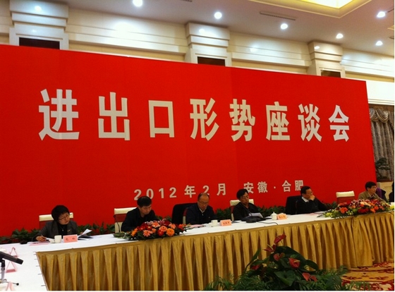 2月11日下午,商務部部長陳德銘在合肥主持召開了進出口形勢座談會。安徽省副省長花建慧、省政府副秘書長張武揚、省商務廳廳長方西屏,商務部國際貿易談判代表秘書局局長兼辦公廳副主任沈丹陽、政研室主任張向晨、流通發展司司長向欣、外資司司長劉亞軍等領導以及安徽省12家重點進出口企業代表參加了會議。