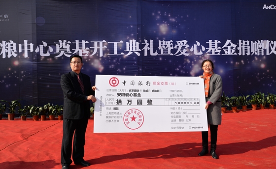 11點30分,伴隨著施工機械的轟鳴聲,有關領導共同培土,安糧中心奠基暨愛心基金捐贈儀式圓滿結束。