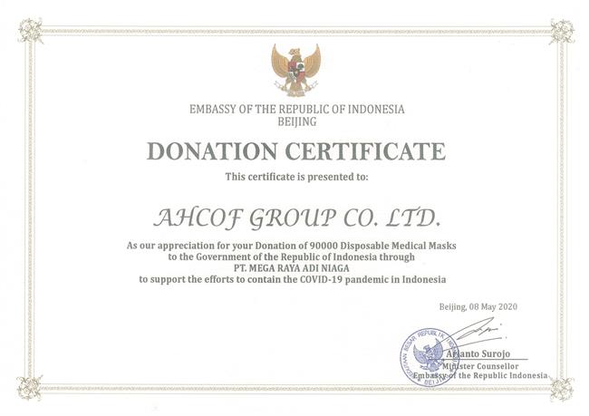 5月8日,印尼駐華大使館向安糧集團(tuán)發(fā)來捐贈(zèng)證明書,以此表達(dá)對(duì)安糧集團(tuán)捐贈(zèng)印尼政府9萬只口罩之舉的誠摯感謝!