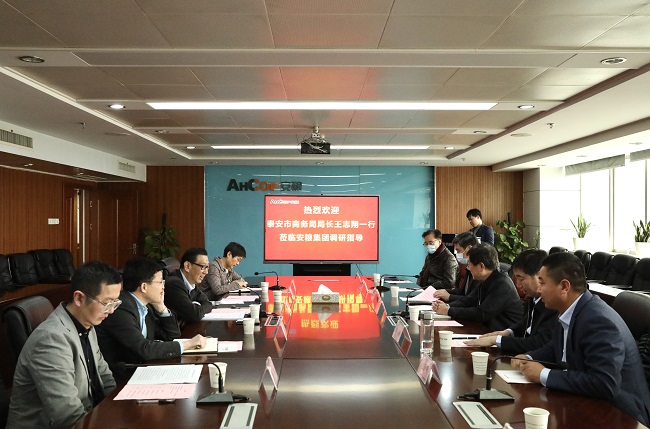 周洪副總裁對王局長一行的到來表示歡迎,并介紹了公司的發展歷程、業務板塊及2020年經營情況。王局長簡要介紹了泰安市發展情況以及當地特色產品,提出希望發揮雙方平臺優勢,拓寬與安糧集團的合作空間。雙方與會人員就農產品研發、產業化建設及推動當地外向型經濟發展等方面展開了深入的交流討論。