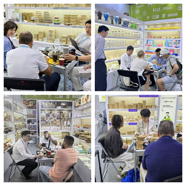 在全球化與個(gè)性化的雙重驅(qū)動(dòng)下,消費(fèi)者對(duì)產(chǎn)品的需求日益多樣化。本期會(huì)展安糧積極擴(kuò)充產(chǎn)品規(guī)格,豐富產(chǎn)品種類,帶來(lái)了深受客戶喜愛的全降解紙杯、紙刀叉、紙質(zhì)蘸料杯等一次性日用品。尤其是本次推出的以竹、木、甘蔗渣等為原材料的新產(chǎn)品輕食盒,在開展當(dāng)天吸引了一大批歐美客戶的咨詢。